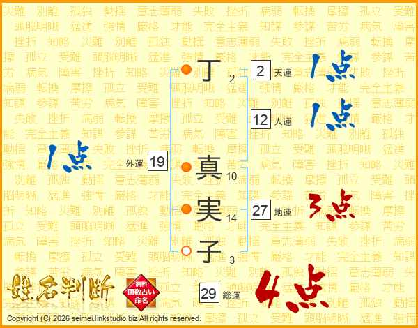 丁(2画) 真(10画)実(14画)子(3画)
