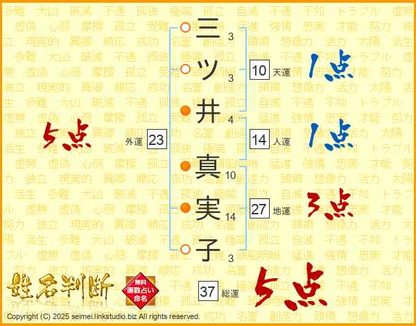 三(3画)ツ(3画)井(4画) 真(10画)実(14画)子(3画)