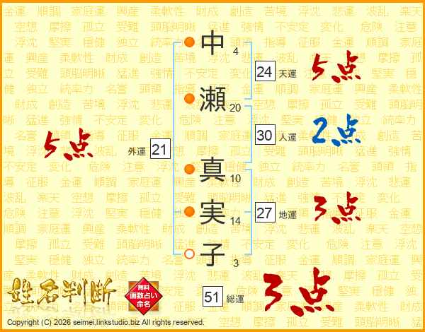 中(4画)瀬(20画) 真(10画)実(14画)子(3画)