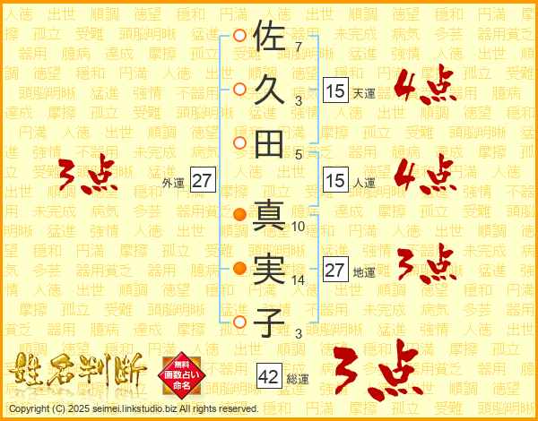佐(7画)久(3画)田(5画) 真(10画)実(14画)子(3画)