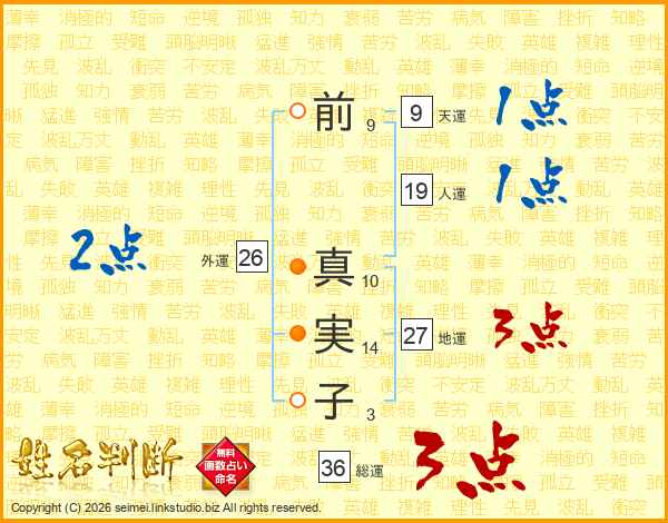 前(9画) 真(10画)実(14画)子(3画)
