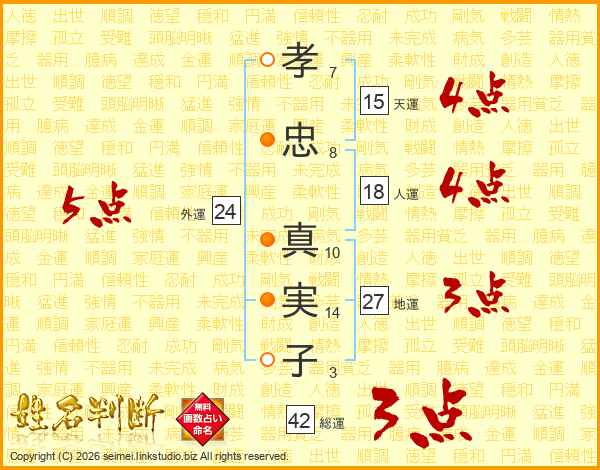 孝(7画)忠(8画) 真(10画)実(14画)子(3画)