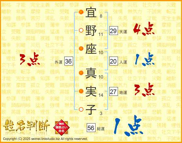 宜(8画)野(11画)座(10画) 真(10画)実(14画)子(3画)