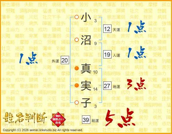 小沼真実子さんの総運は39画の5点!