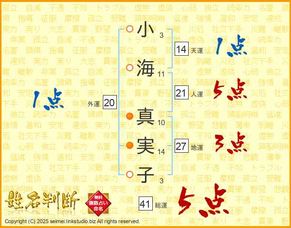 小(3画)海(11画) 真(10画)実(14画)子(3画)