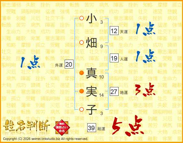 小(3画)畑(9画) 真(10画)実(14画)子(3画)