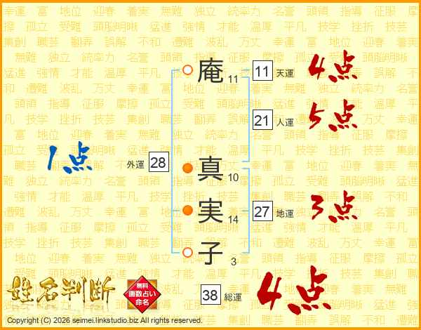 庵(11画) 真(10画)実(14画)子(3画)