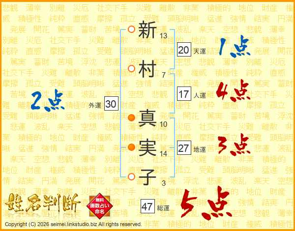 新(13画)村(7画) 真(10画)実(14画)子(3画)