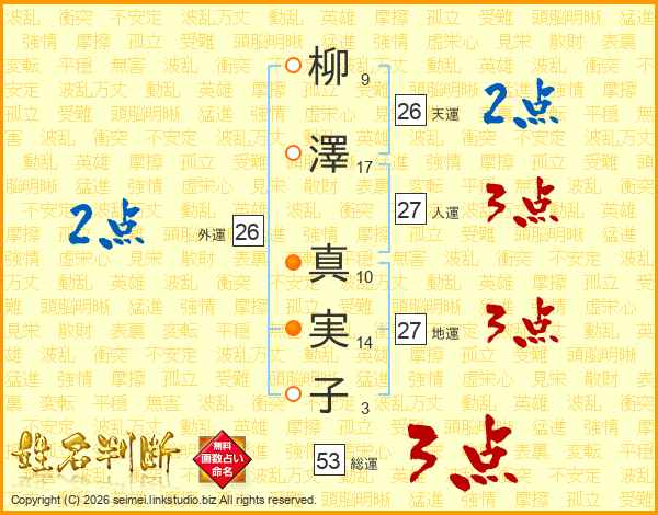 柳(9画)澤(17画) 真(10画)実(14画)子(3画)