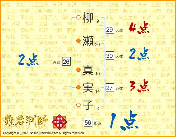 柳(9画)瀬(20画) 真(10画)実(14画)子(3画)