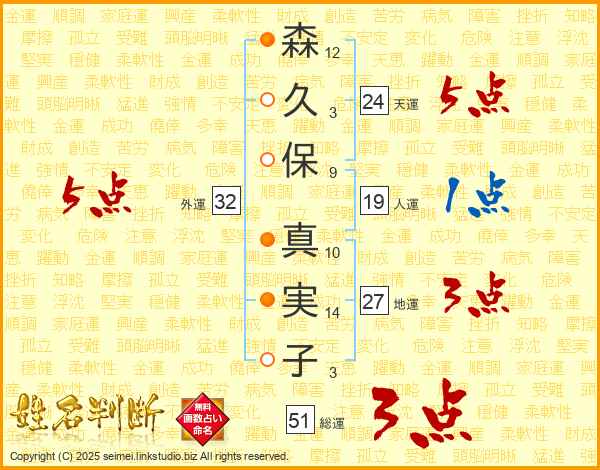 森(12画)久(3画)保(9画) 真(10画)実(14画)子(3画)