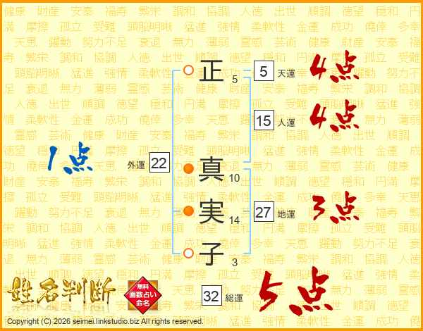生活面を象徴する運勢です。外部から受ける影響力を表し、結婚運、家庭運や職場、環境への順応性を表します。総運から人運を引いた画数。姓や名が1文字の場合を除く。