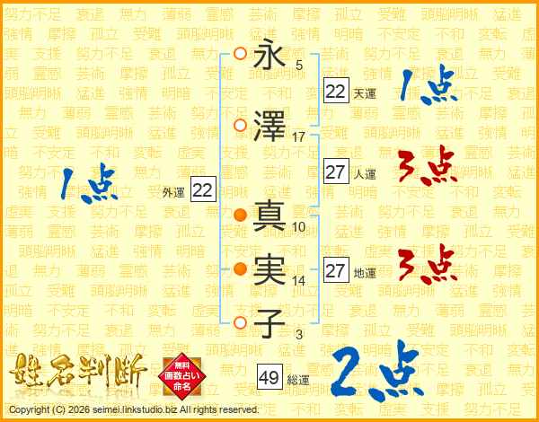 永(5画)澤(17画) 真(10画)実(14画)子(3画)