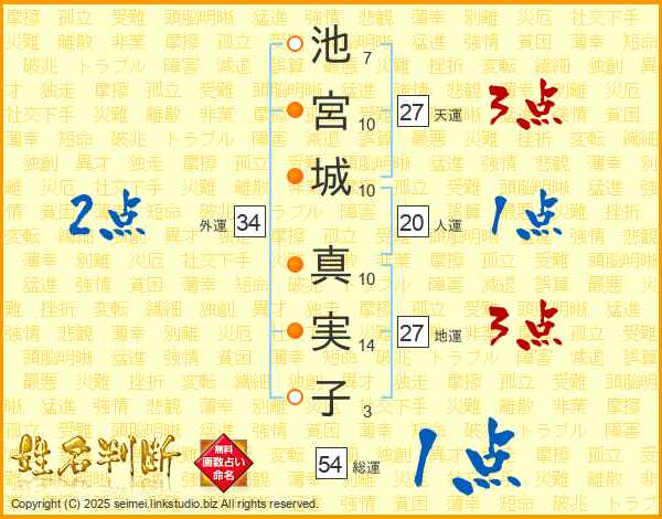 池(7画)宮(10画)城(10画) 真(10画)実(14画)子(3画)