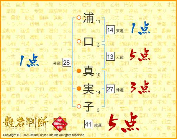 浦(11画)口(3画) 真(10画)実(14画)子(3画)