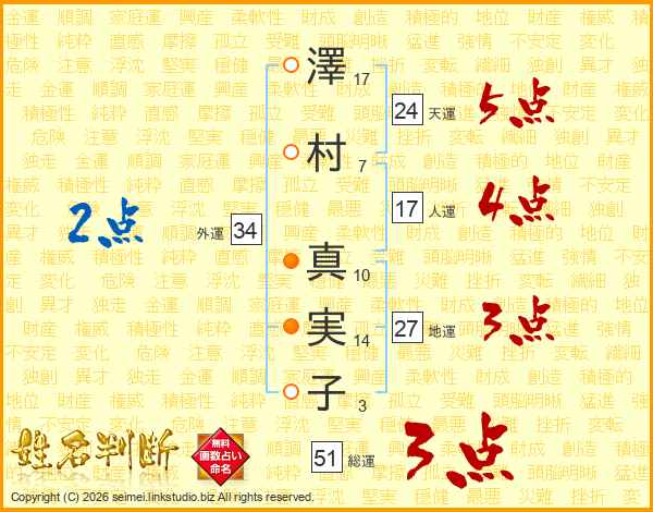 澤(17画)村(7画) 真(10画)実(14画)子(3画)