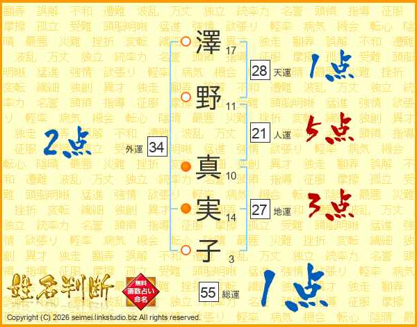 澤(17画)野(11画) 真(10画)実(14画)子(3画)
