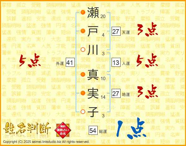 瀬(20画)戸(4画)川(3画) 真(10画)実(14画)子(3画)