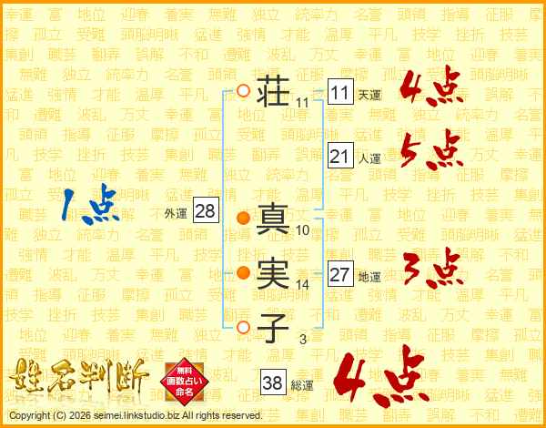 荘(11画) 真(10画)実(14画)子(3画)