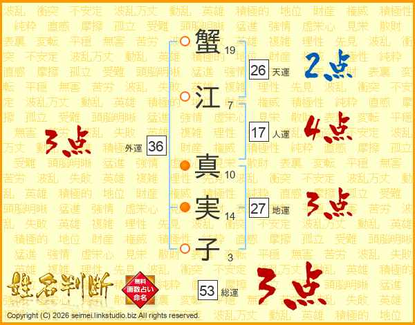蟹(19画)江(7画) 真(10画)実(14画)子(3画)