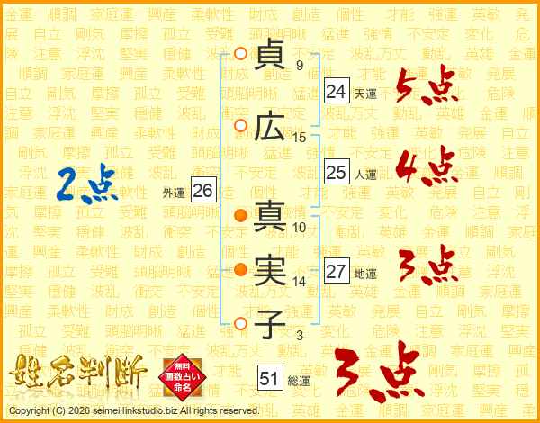 貞(9画)広(15画) 真(10画)実(14画)子(3画)