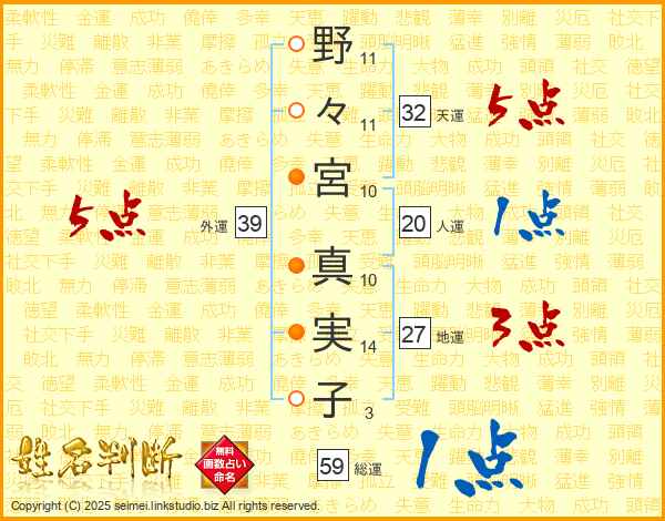 野々宮真実子さんの総運は59画の1点!