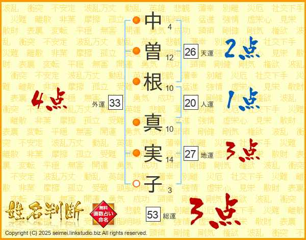 中(4画)曽(12画)根(10画) 真(10画)実(14画)子(3画)