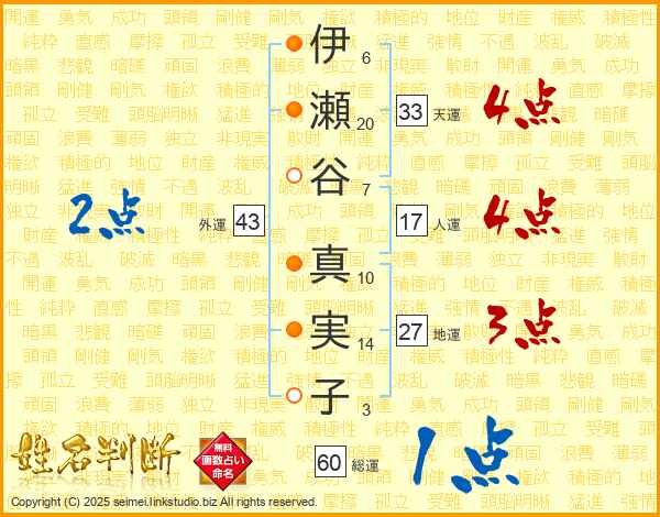 伊(6画)瀬(20画)谷(7画) 真(10画)実(14画)子(3画)