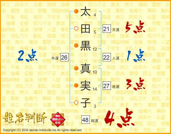 太(4画)田(5画)黒(12画) 真(10画)実(14画)子(3画)