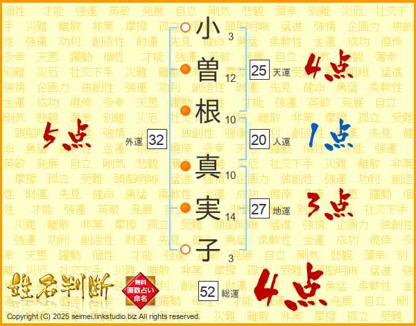 小(3画)曽(12画)根(10画) 真(10画)実(14画)子(3画)