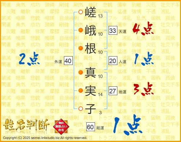 嵯(13画)峨(10画)根(10画) 真(10画)実(14画)子(3画)