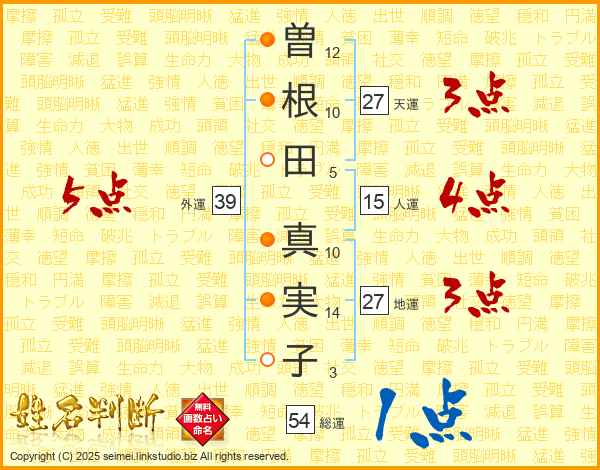 曽(12画)根(10画)田(5画) 真(10画)実(14画)子(3画)