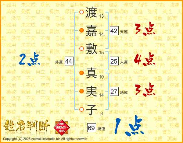 渡(13画)嘉(14画)敷(15画) 真(10画)実(14画)子(3画)