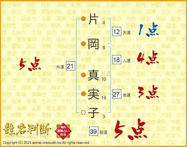 片(4画)岡(8画) 真(10画)実(14画)子(3画)