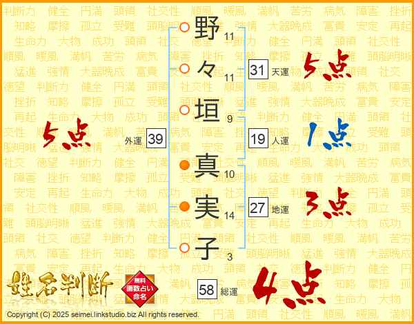 野(11画)々(11画)垣(9画) 真(10画)実(14画)子(3画)