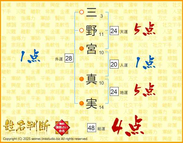 三(3画)野(11画)宮(10画) 真(10画)実(14画)