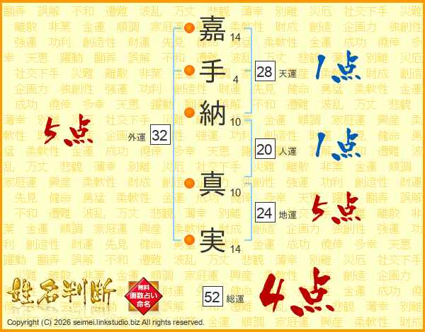 嘉(14画)手(4画)納(10画) 真(10画)実(14画)
