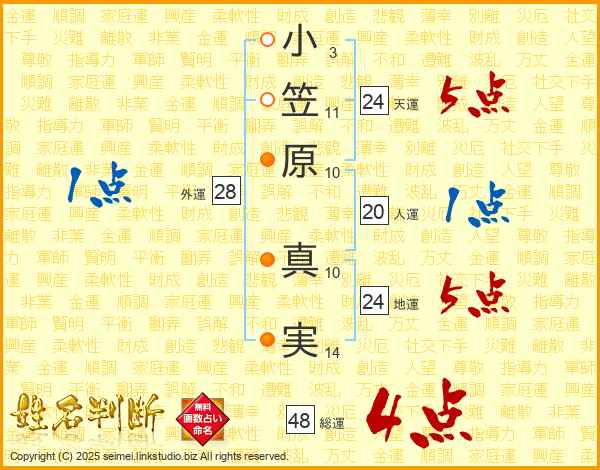 小(3画)笠(11画)原(10画) 真(10画)実(14画)
