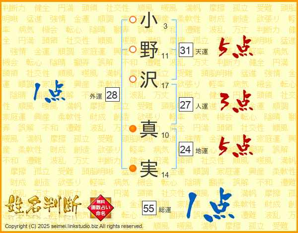 小(3画)野(11画)沢(17画) 真(10画)実(14画)