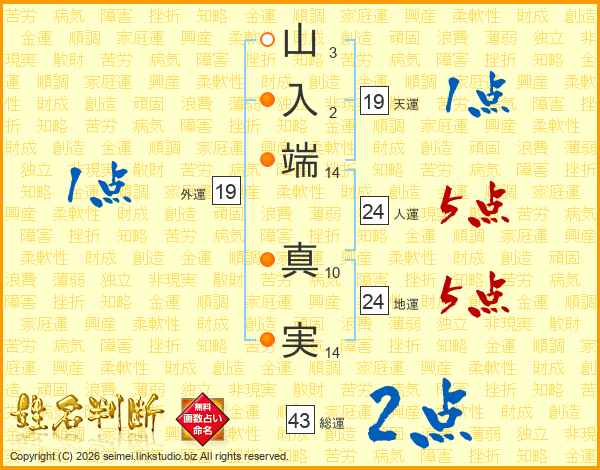 山(3画)入(2画)端(14画) 真(10画)実(14画)