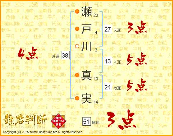 瀬(20画)戸(4画)川(3画) 真(10画)実(14画)