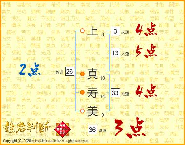 生活面を象徴する運勢です。外部から受ける影響力を表し、結婚運、家庭運や職場、環境への順応性を表します。総運から人運を引いた画数。姓や名が1文字の場合を除く。