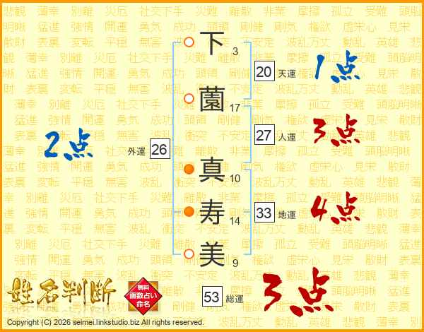 下(3画)薗(17画) 真(10画)寿(14画)美(9画)