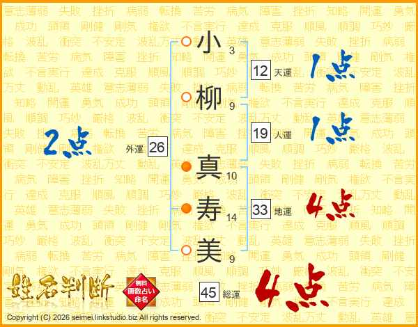 小(3画)柳(9画) 真(10画)寿(14画)美(9画)