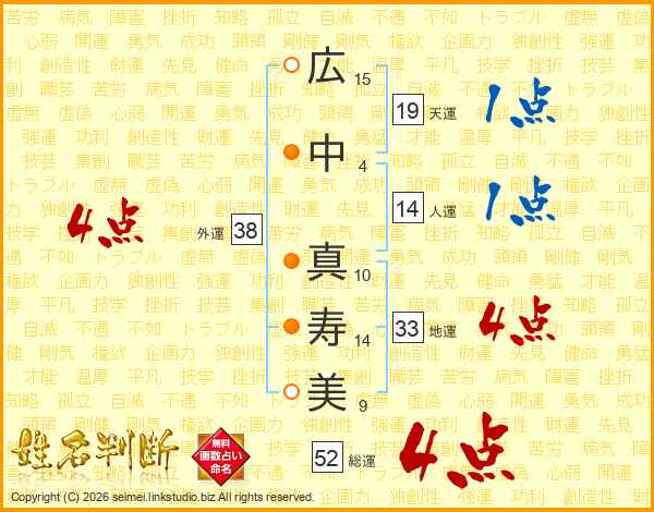 広(15画)中(4画) 真(10画)寿(14画)美(9画)