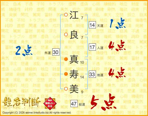 江(7画)良(7画) 真(10画)寿(14画)美(9画)