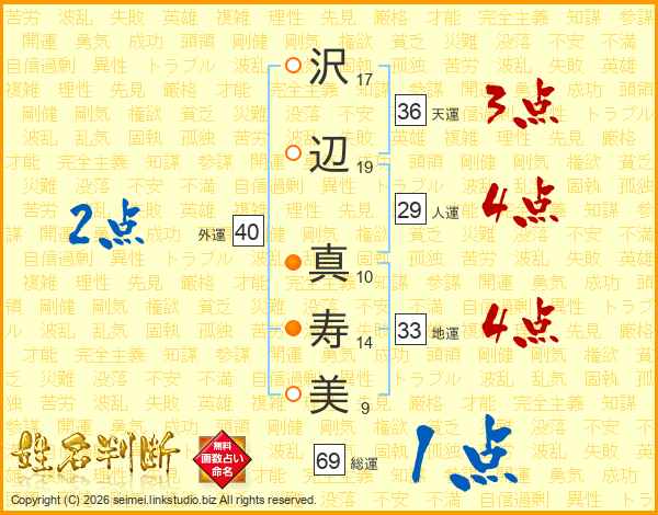 沢(17画)辺(19画) 真(10画)寿(14画)美(9画)