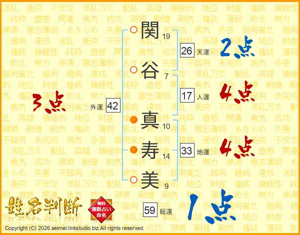 関(19画)谷(7画) 真(10画)寿(14画)美(9画)