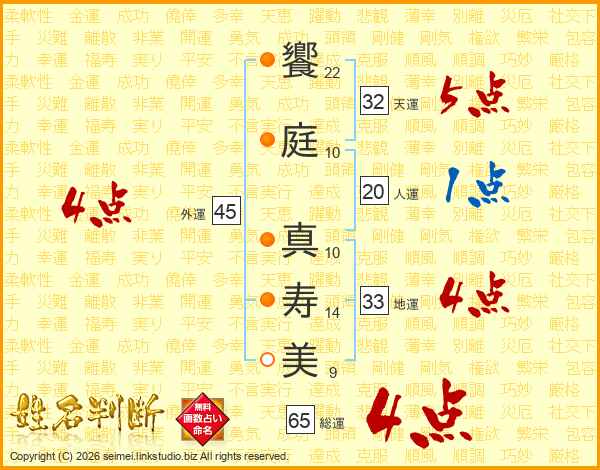 饗(22画)庭(10画) 真(10画)寿(14画)美(9画)