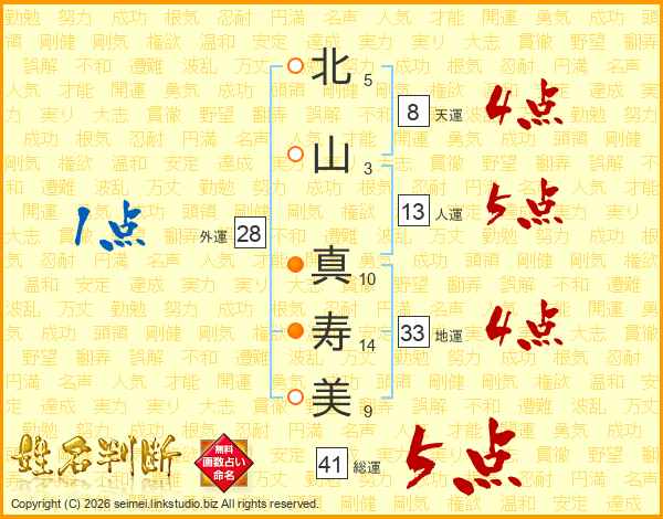 北(5画)山(3画) 真(10画)寿(14画)美(9画)